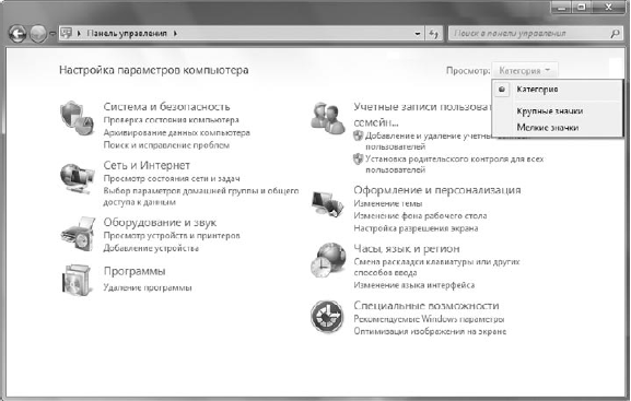 Чтобы сменить режим просмотра, нужно использовать список Просмотр в верхней левой части окна. При щелчке на нем появляется список из трех позиций: Категория, Крупные значки, Мелкие значки (рис. 5.2). Последние два режима отличаются только размером самих значков, что влияет на количество значков, которые одновременно отображаются в окне. Так, если выбрать режим Мелкие значки, в окне отобразится максимальное их количество.