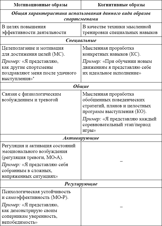 * Примечание: все примеры, приведенные в таблице, представляют собой пункты специального опросника «The Sport Imagery Questionnaire» (SIQ), разработанного на базе данной модели и направленного на измерение частоты спонтанного использования спортсменами различных видов образов.