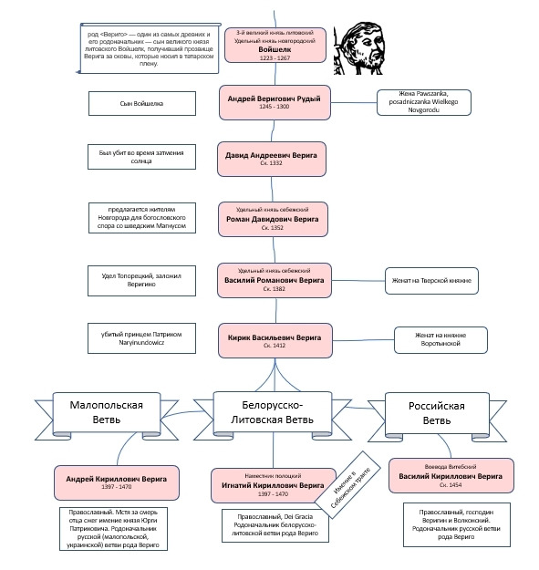 Для того, чтобы осознать древность рода Вериго, обратимся к прародителю рода, Князю Войшелку [Wiki01], благодаря которому род получает свое название. Встречается различное написание имени Войшелк (Вышелк, Вышелег, Вошелег, Войселк, Волштыник, Волстыник, в том числе Василий – имя которое встречается и на гербе, и проходит красной нитью через поколения, можно заключить, что св. Василий является покровителем рода Вериго).