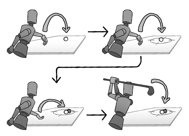 Четвертый шаг – все то же самое, но теперь бросок осуществляется не самой рукой, а специальным орудием, например «клюшкой» (как в гольфе). То есть здесь уже нужна не только тактика, но еще и мастерство в освоении искусственного предмета, без которого теперь просто не удастся играть.