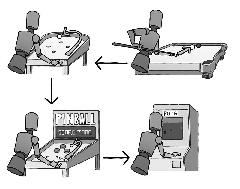 Для наглядности следует снова вернуться к Pong. В предыдущей главе я уже показал, как Pong превращалась в самые разные игры; сейчас же настал момент продемонстрировать, как ранние игры постепенно превратились в Pong. Причем самое удивительное здесь то, что в такой логической реконструкции нет ничего сложного. Более того, для того чтобы прочертить путь развития от древнейших игр к Pong, мне понадобится всего-навсего восемь шагов (это как раз и есть применение подхода из предыдущей главы).