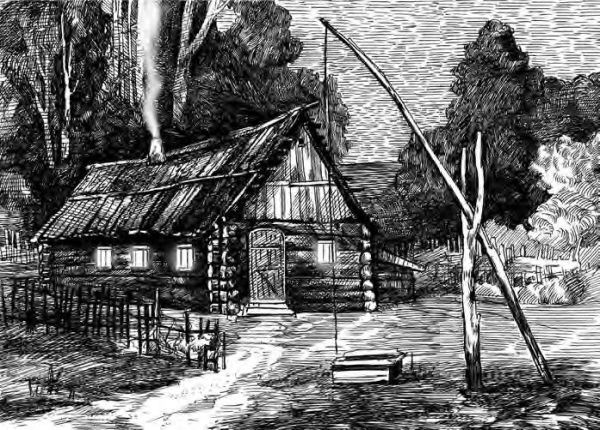 Лиловые и жёлтые отсветы на гаснущем небе вычерчивали контуры каждой взметнувшейся кроны. Над этими силуэтами грозно нависал крюк колодезного журавля, а чуть поодаль торчал кверху неизвестного назначения голый столб.
