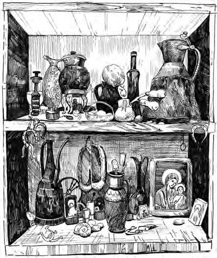 Тогда было решено призвать на помощь хозяина квартиры, и Георгий категорично направился в открытый дверной проём. Свет в коридоре горел как мог – обе лампочки тускло освещали длиннющую узкую кишку с дверями по бокам. Посреди кишки громоздился некий обрушенный предмет мебели – то ли маленький шкаф, то ли нечто наподобие; разлетевшиеся осколки зеркала, шапки и шарфы заполнили собой почти весь и без того сдавленный лаз в недра диковинной обители. Обои на стенах выцвели и были замызганы. Приколоченные полки обнаруживали непостижимую и безнадёжно полоумную смесь экспонатов: кувшины, ржавые подковы, иконы, хитроумные деревяхи непонятного назначения, засушенные пряники, горшки. На отдельном гвозде красовались лапти. Звуков из внутренних комнат не раздавалось.