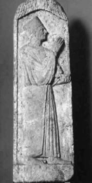 Мелькарт представлен на этой стеле в виде полуобнаженного мужа в коническом колпаке и с топором на плечах. Это – самое раннее его изображение, известное нам. В Тире подобного памятника не сохранилось.