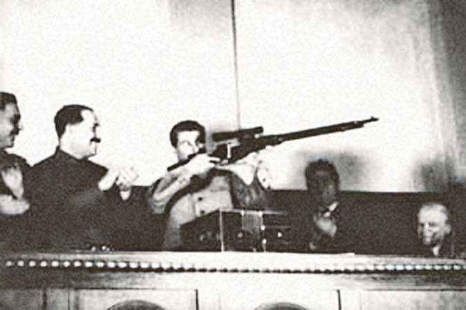 Здесь представлена одна из самых известных фотографий Сталина. Вождь народа смотрит через прицел легендарной трёхлинейки – винтовки Мосина – на полный зал делегатов XVII съезда ВКП(б). Кадр можно назвать пророческим: направляя прицел на почти двухтысячную аудиторию, Сталин будто предугадывает их судьбу. Через несколько лет чуть больше тысячи «посланцев» партии понесли наказание, остальные, за исключением немногих, – расстреляны.