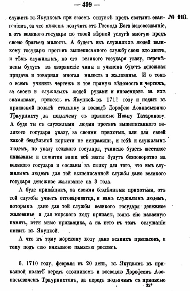 6. 1710 году, февраля в 20 день, в Якуцком в приказной полате перед столником и воеводою Дорофеем Афонасьевичем Траурнихтом, да перед подьячим с приписью [500]