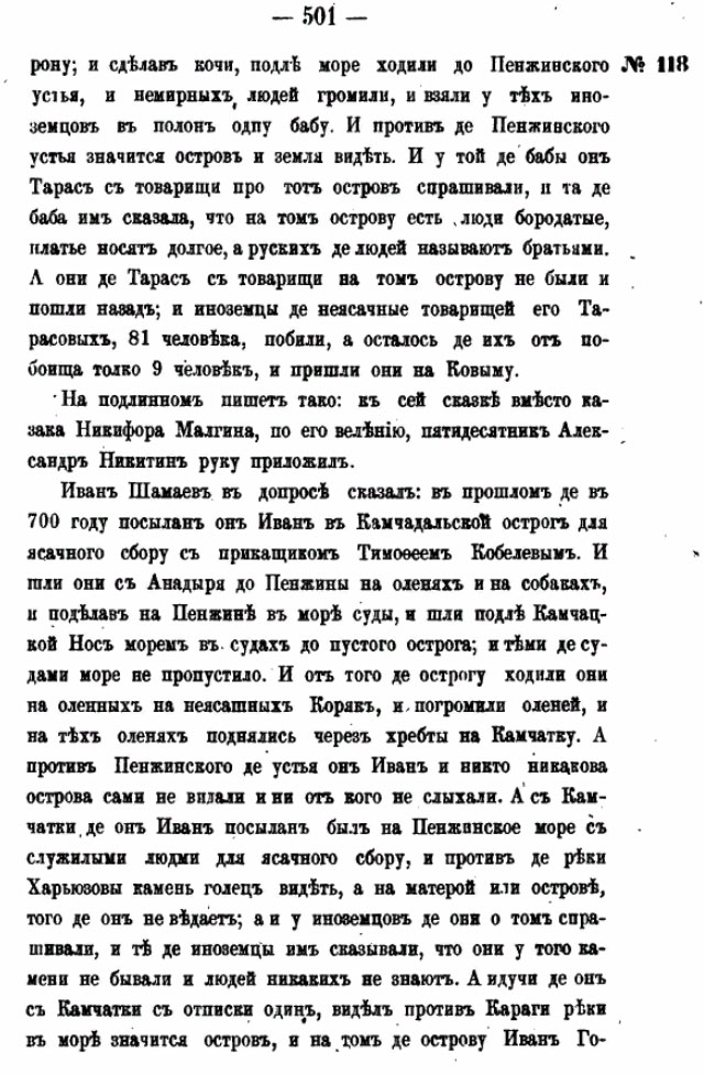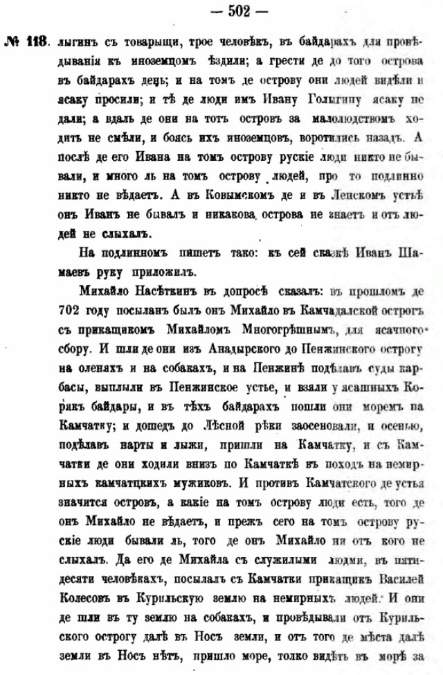 Иван Шамаев в допросе сказал: в прошлом де в 700 году посылан он Иван в Камчадальской острог для ясачного сбору с прикащиком Тимофеем Кобелевым. И шли они с Анадыря до Пенжины на оленях и на собаках, и поделав на Пенжине в море суды, и шли поде Камчацкой Нос морем в судах до пустого острога; и теми де судами море не пропустило. И от того де острогу ходили они на оленных на неясашных Коряк, и погромили оленей, и на тех оленях поднялись через хребты на Камчатку. А против Пенжинского де устья он Иван и никто никакова острова сами не видали и ни от кого не слыхали. А с Камчатки де он Иван посылан был на Пенжинское море с служилыми людми для ясачного сбору, и против де реки Харьюзовы камень голец видеть, а на матерой или остров, того де он не ведает; а и у иноземцов де они о том спрашивали, и те де иноземцы им сказывали, что они у того камени не бывали и людей никаких не знают. А идучи де он с Камчатки с отписки один, видел против Караги реки в море значится остров, и на том де острову Иван [502] Голыгин с товарищи, трое человек, в байдарах для проведывания к иноземцом ездили; а грести де до того острова в байдарах день; и на том де острову они людей видели и ясаку просили; и те де люди им Ивану Голыгину ясаку не дали; а вдаль де они на тот остров за малолюдством ходить не смели, и боясь их иноземцов, воротились назад. А после де его Ивана на том острову руские люди никто не бывали, и много ль на том острову людей, про то подлинно никто не ведает. А в Ковымском де и в Ленском устье он Иван не бывал и никакова острова не знает и от людей не слыхал.