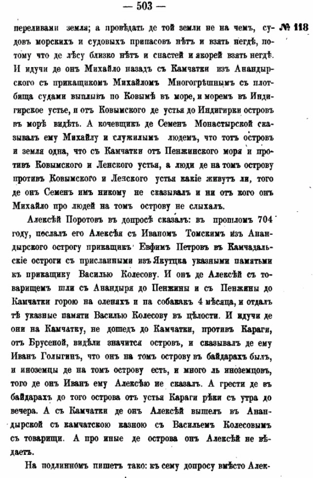Алексей Поротов в допросе сказал: в прошлом 704 году, послал его Алексея с Иваном Томским из Анандырского острогу прикащик Евфим Петров в Камчадальские остроги с присланными из Якутцка указными памятьми к прикащику Василью Колесову. И он де Алексей с товарищем шли с Анандыря до Пенжины и с Пенжины до Камчатки горою на оленях и на собакак 4 месяца, и отдал те указные памяти Василъю Колесову в целости. И идучи де они на Камчатку, не дошед до Камчатки, против Караги, от Брусеной, видели значится остров, и сказывал де ему Иван Голыгин, что он на том острову в байдарах был, и иноземцы де на том острову есть, и много ль иноземцов, того де он Иван ему Алексею не сказал. А грести де в байдарах до того острова от устья Караги реки с утра до вечера. А с Камчатки де он Алексей вышел в Анандырской с камчатскою казною с Василъем Колесовым с товарищи. А про иные де острова он Алексей не ведает.