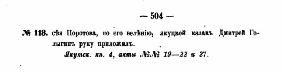 На подлинном пишет тако: к сему допросу вместо [504] Алексея Поротова, по его велению якуцкой казак Дмитрей Голыгин руку приложил.