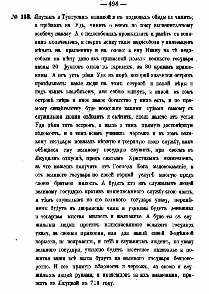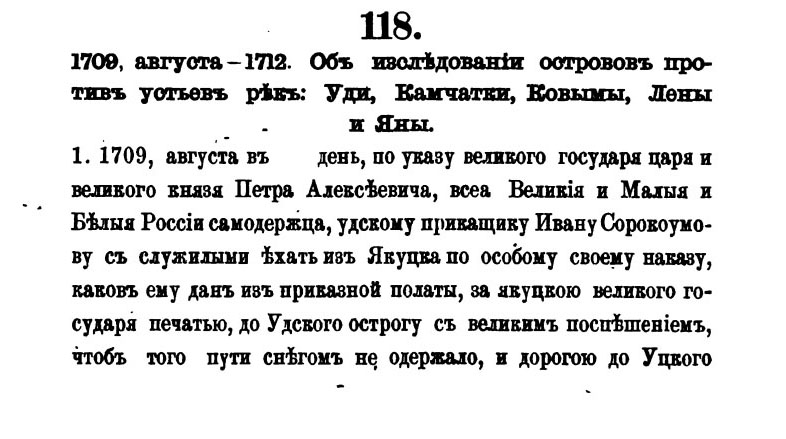 Об исследовании островов против устьев рек: Уди, Камчатки, Ковымы, Лены и Яны1709 году, августа в день, по указу великого государя царя и великого князя Петра Алексеевича, всеа Великия и Малыя и Белыя России самодержца, удскому прикащику Ивану Сорокоумову с служилыми ехать из Якуцка по особому своему наказу, каков ему дан из приказной полаты, за якуцкою великого государя печатью, до Удского острогу с великим поспешением, чтоб того пути снегом не одержало, и дорогою до Уцкого [494] Якутам и Тунгусам никакой и в подводах обиды не чинить; а приехав на Удь, чинить о всем по тому вышеописанному особому наказу. А о недособолях промышлять и радеть с великим попечением, и сверх ясаку такие недособоли у иноземцов менять на крашенину и на олово; а ему Ивану на те недособоли на мену дано из приказной полаты великого государя казны 20 фунтов олова в тарелех, да 30 аршин крашенины. А от усть реки Уди в море которой значится остров проведывать: какие люди на том острове и какой веры и под чьим владеньем, или собою живут, и какой в том острове зверь и иное какое богатство у них есть, и по прямому свидетелству буде возможно какими судами самому с служилыми людми съездить и сметить, сколь далече от устья Уди реки тот остров, и взять о том прямую достоверную ведомость, и о том всем учинить чертеж и в том великому государю показать верную и усердную свою службу, как обещался ему великому государю служить, при своем в Якуцком отпуске, пред святым Христовым евангелием, за что можешь получить от Господа Бога мздовоздаяние, а от великого государя по своей верной услуге многую пред своею братьею милость. А будет кто из служилых людей великому государю против вышеписанного службу свою явит, и тем служилым по его великого государя указу, переменены будут в дворянские чины и учинена будет денежная и товарная многая милость и жалованье. А буде ты с служилыми людми против вышеписанного великого государя указу, за своими прихотми, или для какой своей безделной корысти, не исправишь, и тебе и служилым людем, по указу великого государя, учинено будет жестокое наказанье и пожитки ваши все взяты будут на великого государя бесповоротно. И тое прямую ведомость и чертеж, за своею и служилых людей руками, и иноземцов за их знаменами, привезть в Якуцкой в 710 году.
