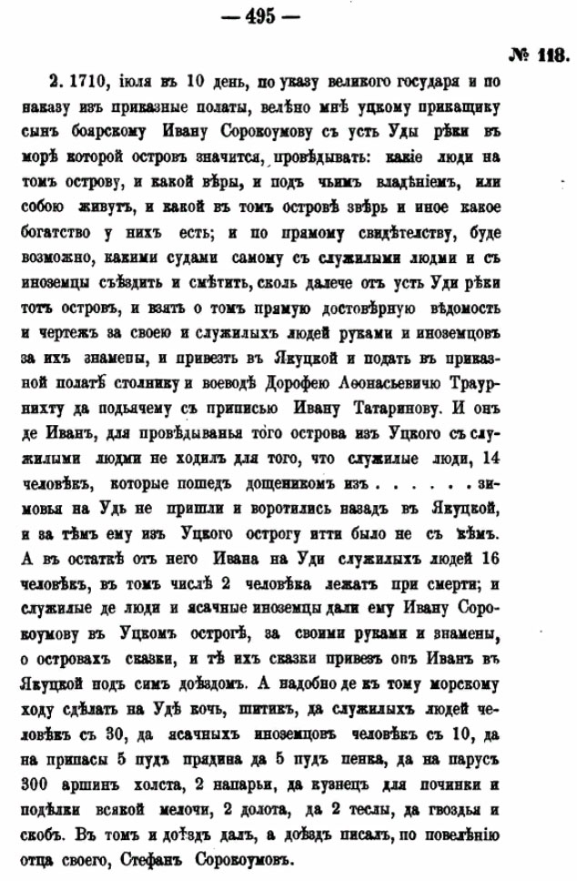 2. [495] 1710, июля в 10 день, по указу великого государя и по наказу из приказные полаты, велено мне уцкому прикащику сын боярскому Ивану Сорокоумову с усть Уды реки в море которой остров значится, проведывать: какие люди на том острову, и какой веры, и под чьим владением, или собою живут, и какой в том острове зверь и иное какое богатство у них есть; и по прямому свидетелству, буде возможно, какими судами самому с служилыми людми и с иноземцы съездить и сметить, сколь далече от усть Уди реки тот остров, и взять о том прямую достоверную ведомость и чертеж за своею и служилых людей руками и иноземцов за их замены, и привезть в Якуцкой и подать в приказной полате столнику и воеводе Дорофею Афонасьевичю Траурнихту да подьячему с приписью Ивану Татаринову. И он де Иван, для проведыванья того острова из Уцкого с служилыми людми не ходил для того, что служилые люди, 14 человек, которые пошед дощеником из……зимовья на Удь не пришли и воротились назад в Якуцкой, и за тем ему из Уцкого острогу итти было не с кем. А в остатке от него Ивана на Уди служилых людей 16 человек, в том числе 2 человека лежат при смерти; и служилые де люди и ясачные иноземцы дали ему Ивану Сорокоумову в Уцком остроге, за своими руками и знамены, о островах сказки, и те их сказки привез он Иван в Якуцкой под сим доездом. А надобно де к тому морскому ходу сделать на Уде кочь, шитик, да служилых людей человек с 30, да ясачных иноземцов человек с 10, да на припасы 5 пуд прядина да 5 пуд пенка, да на парус 300 аршин холста, 2 напарьи, да кузнец для починки и поделки всякой мелочи, 2 долота, да 2 теслы, да гвоздья и скоб. В том и доезд дал, а доезд писал, по повелению отца своего, Стефан Сорокоумов.
