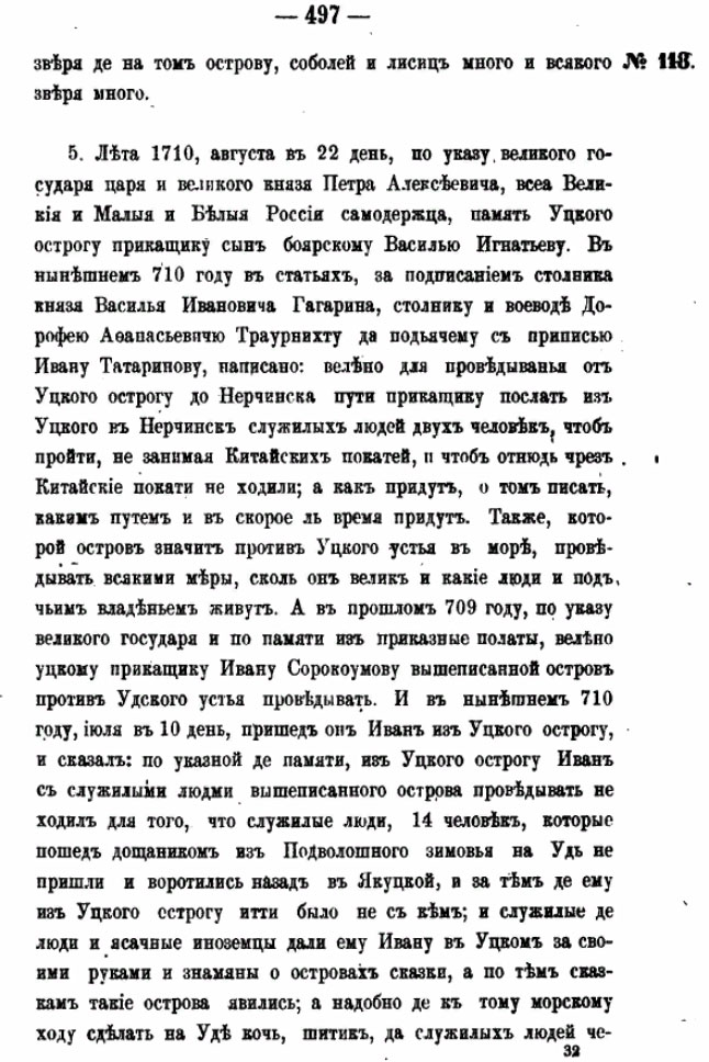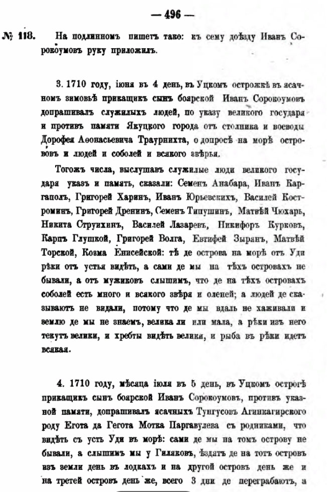 4. 1710 году, месяца июля в 5 день, в Уцком остроге прикащик сын боярской Иван Сорокоумов, против указной памяти, допрашивал ясачных Тунгусов Агинкагирского роду Егота да Гегота Мотка Паргавулена с родниками, что видеть с усть Уди в море: сами де мы на том острову не бывали, а слышим мы у Гиляков, ездят де на тот остров из земли день в лодках и на другой остров день же и на третей остров день же, всего 3 дни де переграбають, а [497] зверя де на том острову, соболей и лисиц много и всякого зверя много.