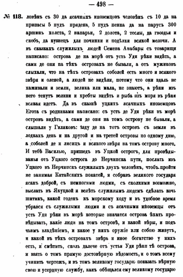 5. Лета 1710, августа в 22 день, по указу великого государя царя и великого князя Петра Алексеевича, всеа Великия и Малыя и Белыя Росии самодержца, память Уцкого острогу прикащику сын боярскому Василью Игнатьеву. В нынешнем 710 году в статьях, за подписанием столника князя Василья Ивановича Гагарина, столнику и воеводе Дорофею Афанасьевичю Траурнихту да подьячему с приписью Ивану Татаринову, написано: велено для проведыванья от Уцкого острогу до Нерчинска пути прикащику послать из Уцкого в Нерчинск служилых людей двух человек, чтоб пройти, не занимая Китайских покатей, и чтоб отнюдь чрез Китайские покати не ходили; а как придут, о том писать, каким путем и в скорое ль время придут. Также, которой остров значит против Уцкого устья в море, проведывать всякими меры, сколь он велик и какие люди и под чьим владеньем живут. А в прошлом 709 году, по указу великого государя и по памяти из приказные полаты, велено уцкому прикащику Ивану Сорокоумову вышеписанной остров против Удского устья проведыват. И в нынешнем 710 году, июля в 10 день, пришед он Иван из Уцкого острогу, и сказал: по указной де памяти, из Уцкого острогу Иван с служилыми людми вышеписанного острова проведывать не ходил для того, что служилые люди, 14 человек, которые пошед дощаником из Подволошного зимовья на Удъ не пришли и воротились назад в Якуцкой, и за тем де ему из Уцкого острогу итти было не с кем; и служилые де люди и ясачные иноземцы дали ему Ивану в Уцком за своими руками и знамяны о островах сказки, а по тем сказкам такие острова явились; а надобно де к тому морскому ходу сделать на Уде кочь, шитик, да служилых людей [498] человек с 30 да ясачных иноземцов человек с 10 да на припасы 5 пуд прядена, 5 пуд пенка да на парус 300 аршин холста, 2 напарьи, 2 долота, 2 теслы, да гвоздья и скоб, да кузнец для починки и поделки всякой мелочи. А в сказках служилых людей Семена Анабары с товарищи написано: острова де на море от усть Уди реки видеть, а сами де они на тех островах не бывали, а от мужиков слыхали, что на тех островах соболей есть много и всякого зверя и оленей, а людей не видели, потому что они вдаль не хаживали и земли, велика или мала, не знают, а реки из него текут велики и хребты видеть и рыба из моря в реки всякая идет. Да в сказке уцких ясачных иноземцов Егота с родниками написано: с усть де Уди реки в море остров видеть, а сами де они на том острову не бывали, а слышали у Гиляков: езду де на тот остров с земли в лодках день и на другой и на третей островы по одному дню, а соболей де и лисиц и всякого зверья на том острову много. И тебе Василью, пришед в Уцкой острог, для проведыванья от Уцкого острога до Нерчинска пути, послать из Уцкого в Нерчинск служилых двух человек, чтоб пройти не занимая Китайских покатей, и собрав великого государя ясак доброй, с немногими людми, с сколкими возможно, выслать в Якуцкой и велеть служилым людем сделать кочь шитик, какой годен к морскому ходу и в удобное время убрався с служилыми людми и с ясачными иноземцы от усть Уди реки в море которые значатся острова ехать проведывать, какие люди на том острове, и какой веры, и под чьим владением, и какое у них оружье или собою живут, и какой в тех островах зверь и иное богатство у них есть, и сметить, сколь далече от устья Уди реки те острова, и взять о том прямую достоверную ведомость, и о том всему учинить чертеж, и в том великому госуд