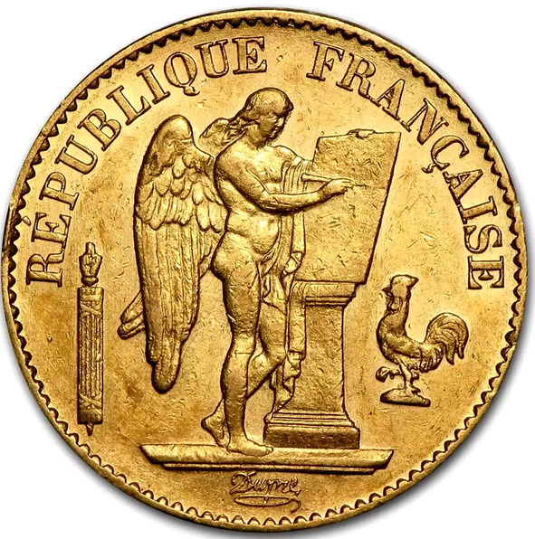 История эта началась с Огюста Дюпре, дворянина. Ему в 1792 году король Луи XVI поручил создать новую валюту для Франции. Говорят, что при создании этой монеты был использовано золото, полученное алхимиком Лестатом.