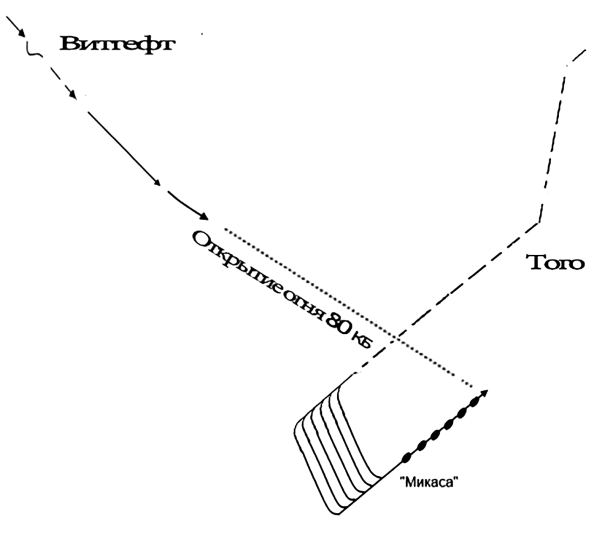В целом общий рисунок эскадренных эволюций был не замысловатым, но содержательным: Того, «гарцуя» на шестнадцати узлах, пытался охватить голову русской эскадры.