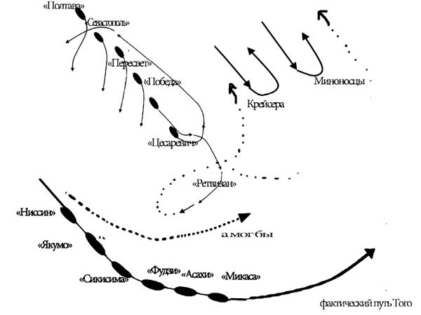 Часть русской колонны неправильным строем фронта приняла на зюйд, словно нацелившись наперерез «концевым» японского отряда, а там слабое звено – крейсера.