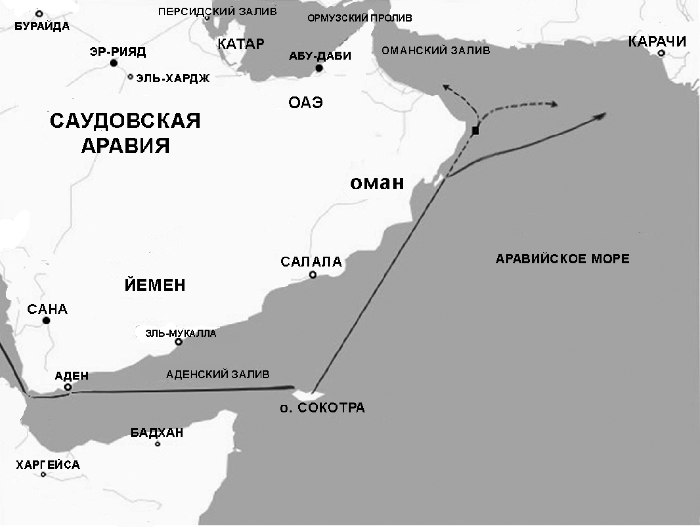 Курсовая линия конвойного отряда проходила по наиболее неприхотливой прямой и «резала угол», постепенно приближаясь к терводам Омана.
