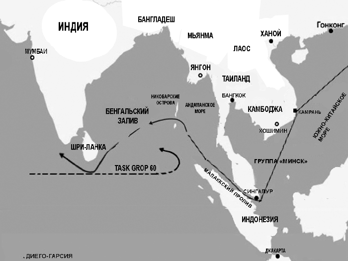 Двигаясь к условной границе Бенгальского залива, «Минск» с кораблями сопровождения свернул свои манёвры, огибая Шри-Ланку по дуге тервод, с очевидным намерением взять курс на западные румбы.