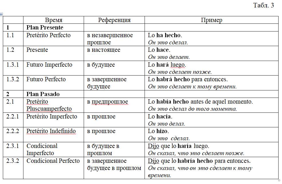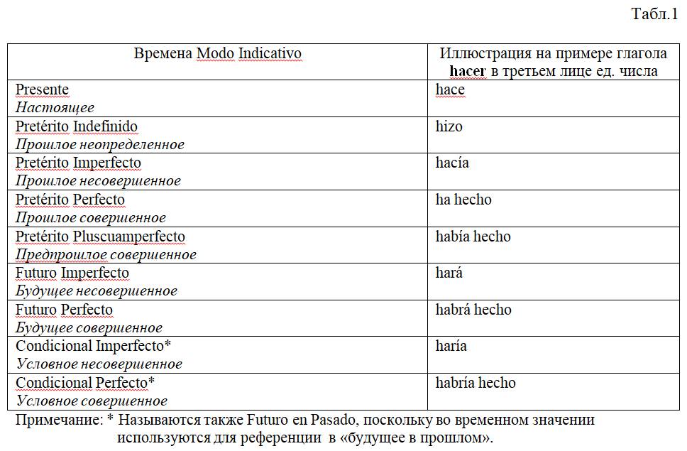 Для выражения этих действий применяется изъявительное наклонение (Modo Indicativo), которое в испанском языке имеет 9 времен (табл. 1).