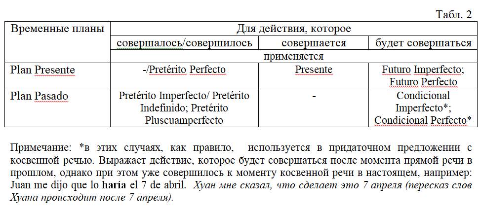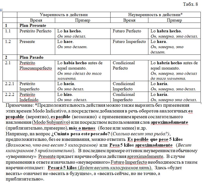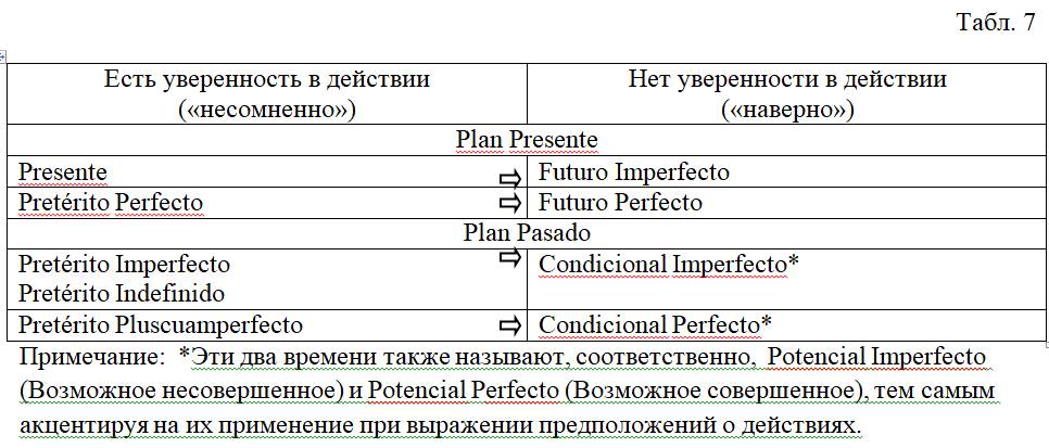 С другой стороны, у субъекта речи может отсутствовать уверенность в реальности действий, совершенных/совершаемых не позже момента речи (т.е. до или одновременно с ним). Неуверенность в их реальности может быть обусловлена различными причинами, включая недостаточность или отсутствие информации. В такой ситуации субъект речи не утверждает, что действие реально, а всего лишь высказывает предположение о его реальности. Для этого в Plan Presente и Plan Pasado применяют, соответственно, Futuro Imperfecto или Futuro Perfecto и Condicional Imperfecto или Condicional Perfecto, которые при этом отсылают не в будущее или в будущее в прошлом, а служат для референции на предположительные действия, соответственно, в настоящем или прошлом. Система соотношения каждого из этих четырех времен при выражении предположительных действий («наверно»), с временами, выражающими те же действия с уверенностью («несомненно») представлена в табл.7.