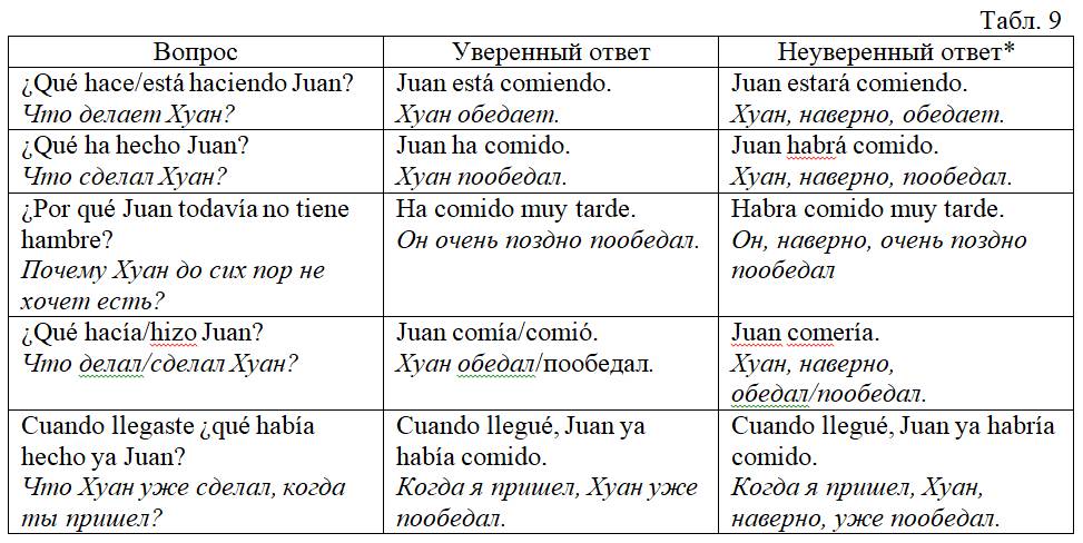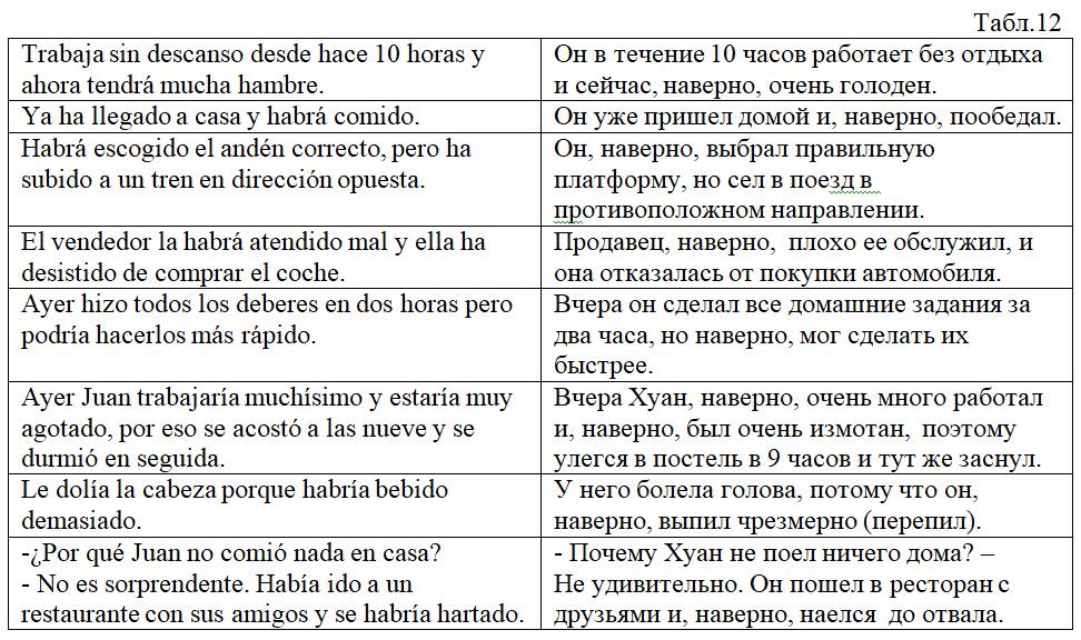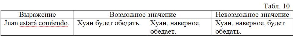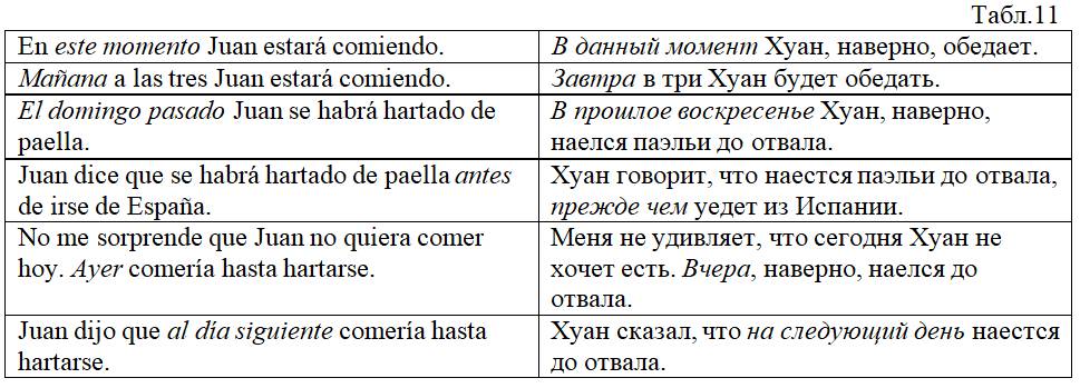 Ни одно из четырех времен (Futuro Imperfecto, Futuro Perfecto, Condicional Imperfecto и Condicional Perfecto) никогда не применяются для выражения будущих предположительных действий, а применяются исключительно либо для выражения действий будущих, либо для выражения действий предположительных (табл.10).