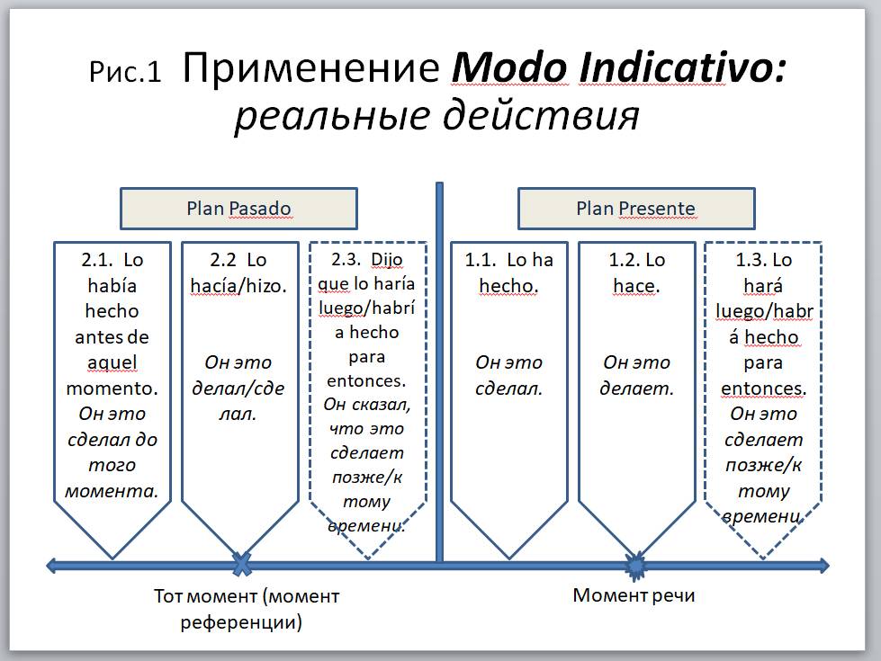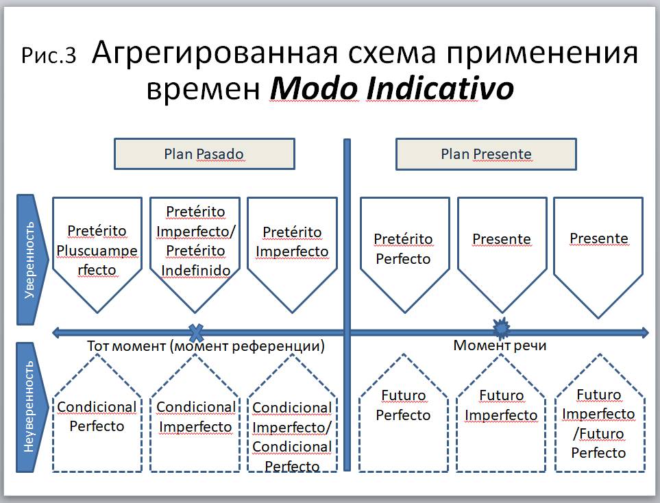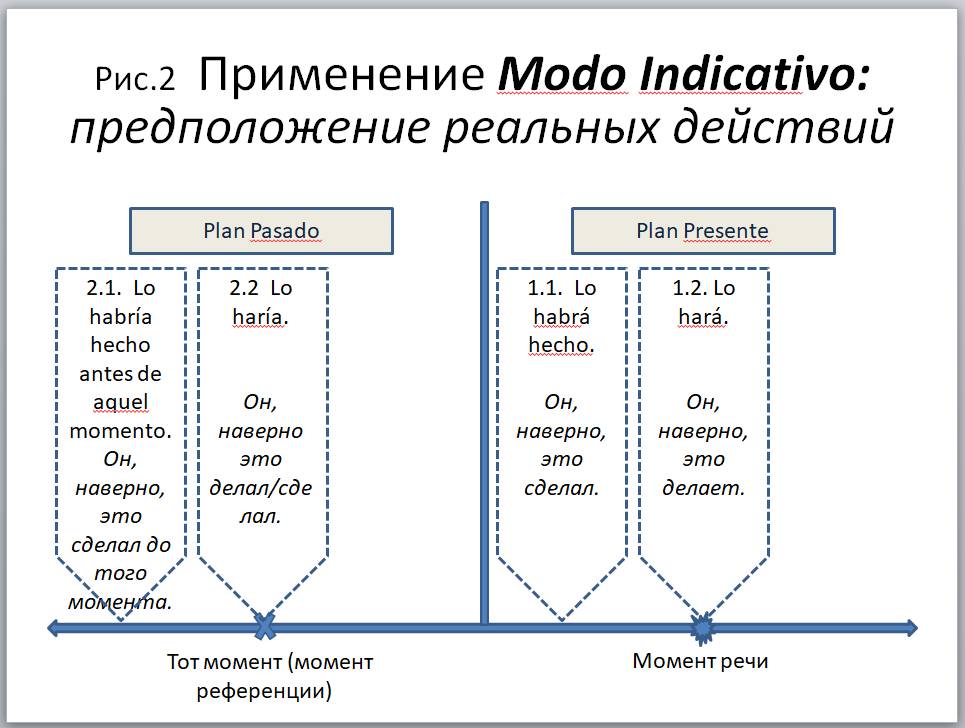 Примеры применения времен Modo Indicativo для выражения уверенности или неуверенности в реальности действия, совершаемом/совершенном не позже момента речи в Plan Presente (момента референции в Plan Pasado) представлены в табл. 8, а графическое изображение примеров «неуверенности» на рис.2.