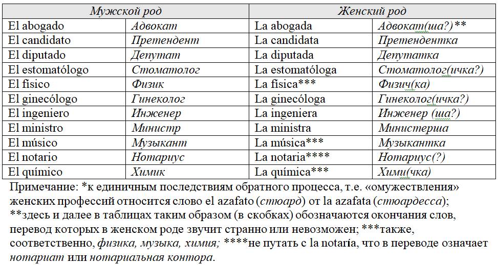 С учетом ранее указанной тенденции на «оженственнение» мужских ролей, таких слов остается все меньше и меньше. Как видно из этой таблицы, часть из них относится к службе в армии, которая, похоже, показалась представительницам прекрасного пола менее привлекательной (за исключением некоторых латиноамериканских стран), чем руководящие позиции в невоенной области, и поэтому менее «оккупированной» ими.