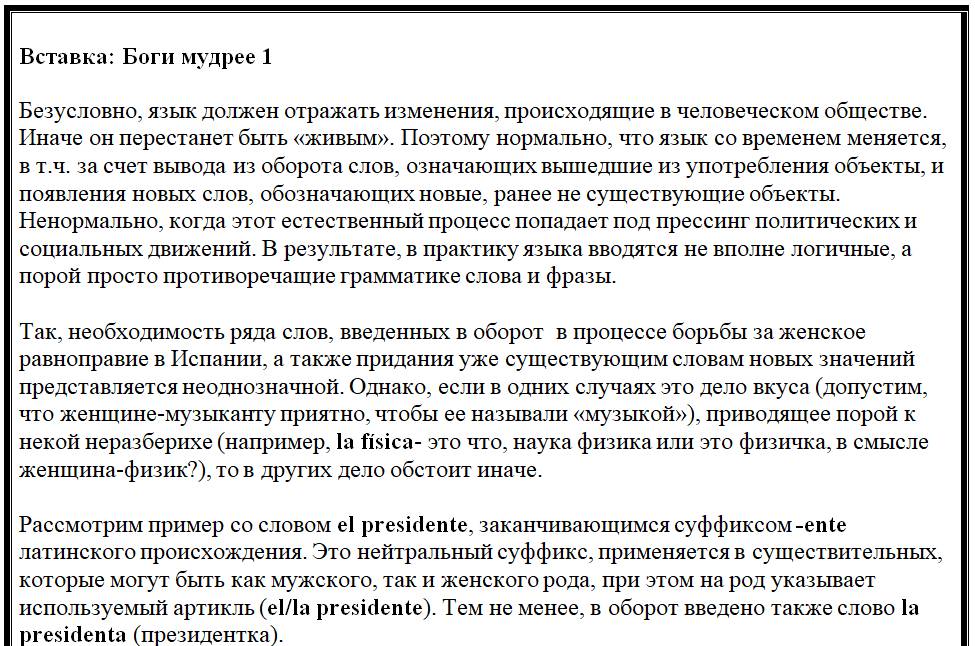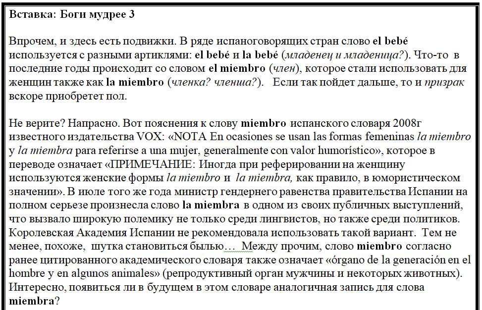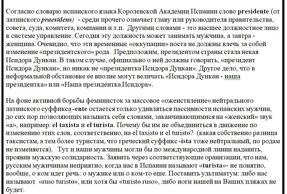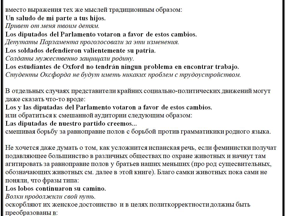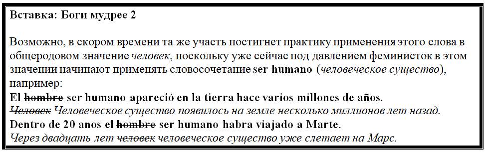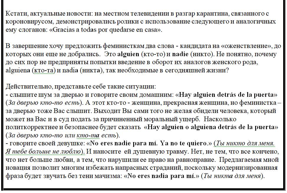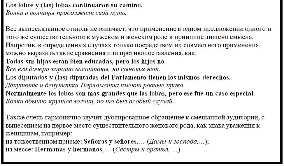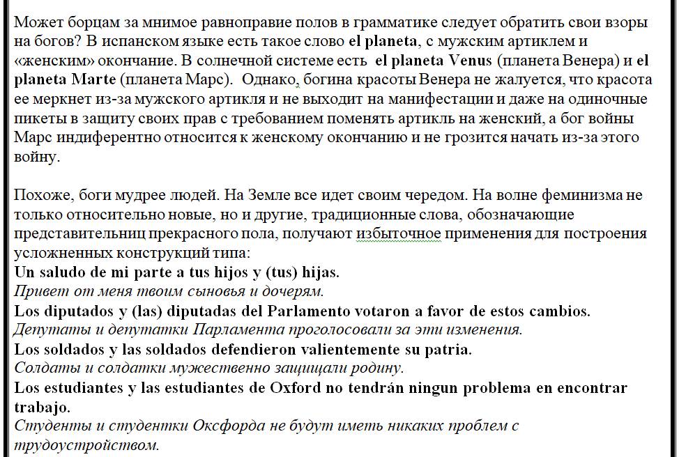 При этом, отдается должное дипломатическим способностям представительниц прекрасной половины человечества. Так, если проблема (el problema) в испанском языке мужского рода, то ее решение (la solución) – женского (см. ниже).