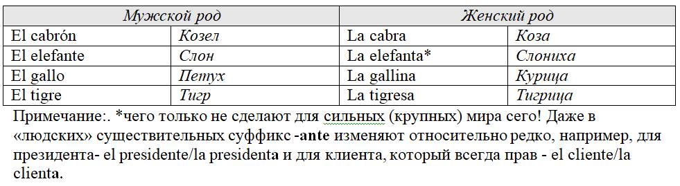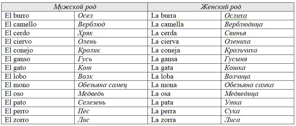 В случаях, когда пол таких животных известен и имеет значение, для его идентификации после видового наименования животного применяют слова macho (самец) и hembra (самка), например: el cocodrilo macho (самец крокодила), el mosquito hembra (самка комара), la pantera macho (самeц пантеры).