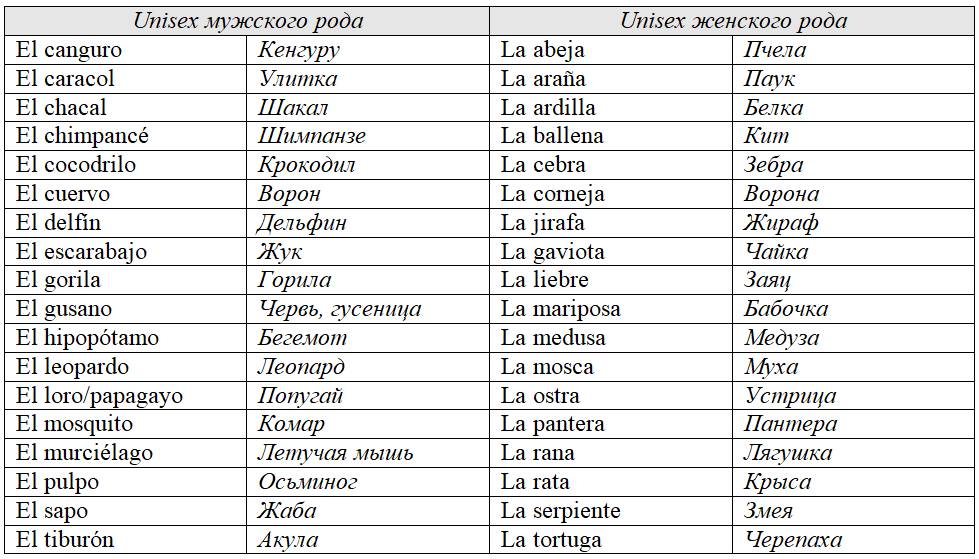 Unisex у животных иной, чем у людей. В данном случае, речь идет не о unisex оболочке, которая «надевается» на животное того или иного пола. Здесь unisex само наименование животного, хотя обозначающее его существительное имеет мужской или женский род. Так, существительное el murciélago (летучая мышь) – мужского рода, lа rata (крыса) - женского рода, хотя первое также означает самку, а второе самца. Таких существительных достаточно много, среди них: