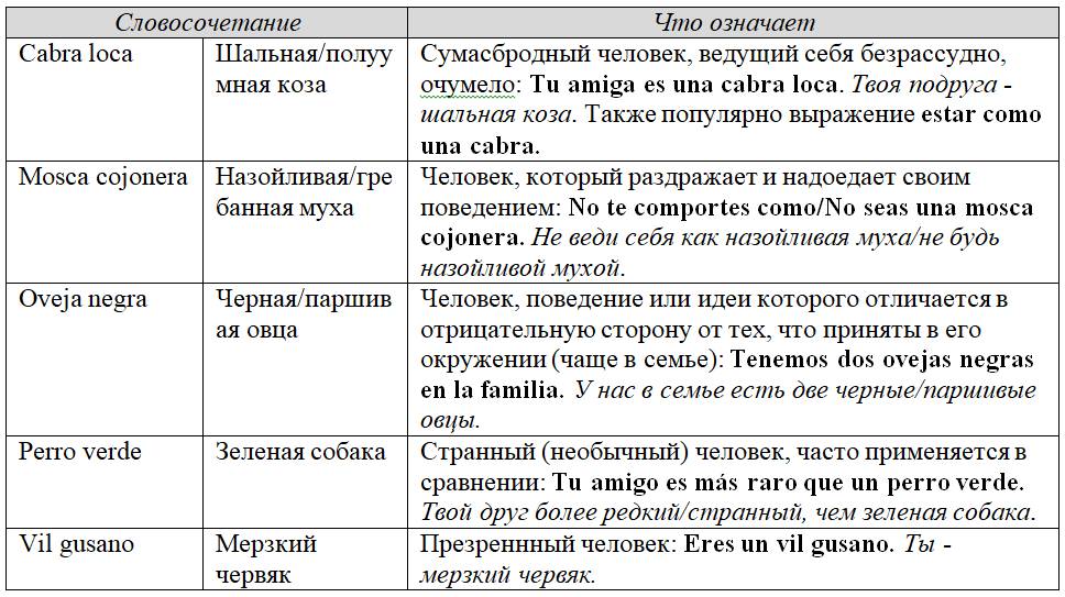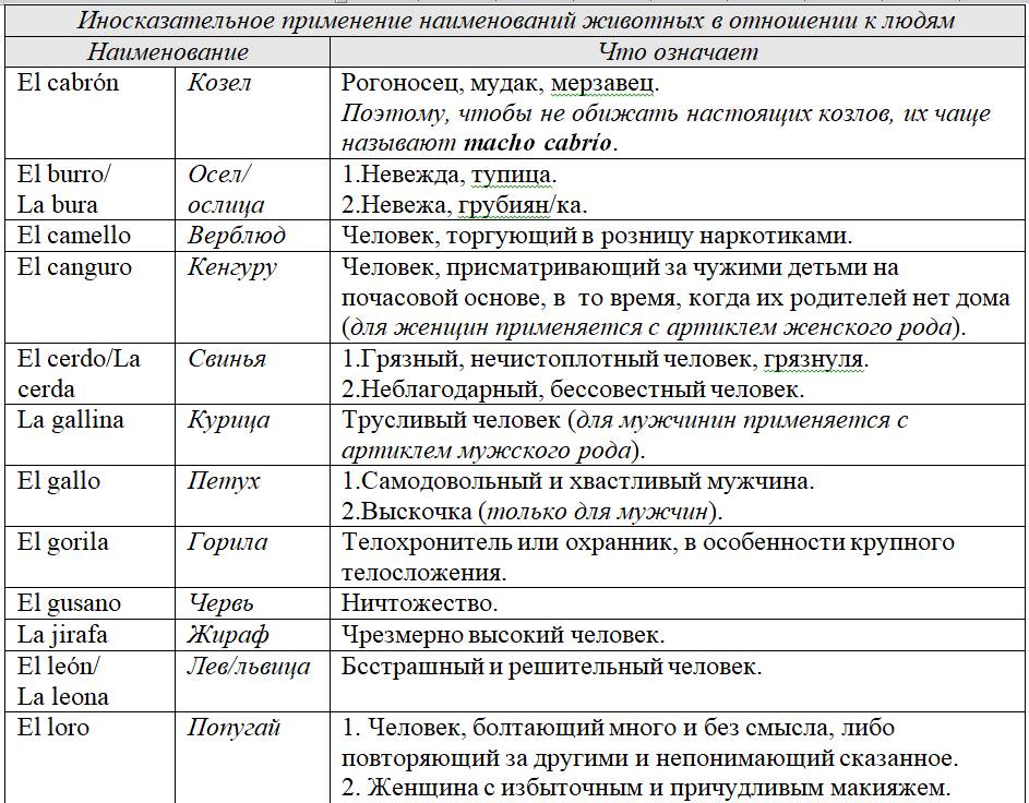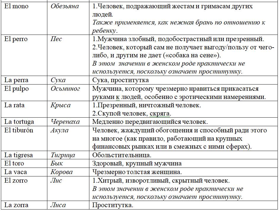 В заключение отметим, что существительные, обозначающие животных, применяются в испанском языке также для референции на людей, которые своей внешностью, повадками и т.д. напоминают этих животных. Ниже приведены наиболее распространенные из этих референций, многие из которых аналогичны их применению в русском языке: