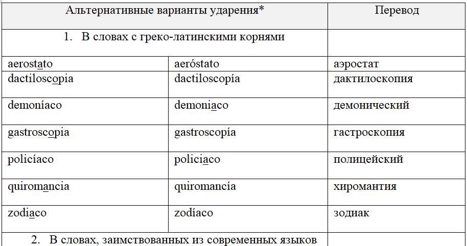 В первом случае, альтернатива выражается в выборе между ударениями, присущими этим древним языкам и ударениями, соответствующими испанскому произношению, во втором – между произношением на языке оригинала и произношением согласно испанским правил. Если в первом случае – это альтернатива чисто теоретическая, то во втором – практическая: чем лучше испаноговорящие владеют современными иностранными языками, тем больше у них искус применять в заимствованных словах оригинальное ударения. К словам с альтернативными ударениями, в частности, относятся: