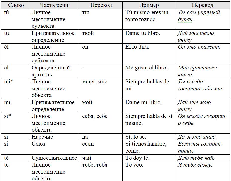 Например, звучащее как [ту] слово может означать на испанском языке личное местоимение ты или притяжательное местоимение твой. Пишется оно в обоих случаях одинаково: tu. Для того, чтобы в письменной речи отличать одно от другого, над одним из них ставится знак ударения. Таким образом, получается два разных графических изображения tú (ты) и tu (твой).