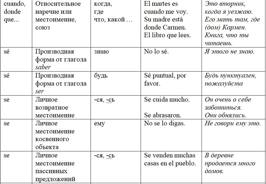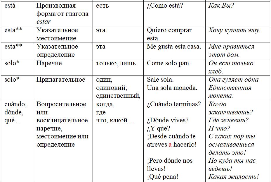 Примечание:* в отличие от местоимений mí и sí местоимение ti пишется без ударения, поскольку не существует слов, схожих с ним по написанию; ** указательные местоимения и указательные определения este/a, ese/a, aquel/la относятся к одной и той же, первой группе. Поэтому пишутся без ударения всегда, за исключением случаев, когда существует риск их двусмысленного понимания. В таких случаях местоимение выделяется знаком ударения: ¿Por qué tiran aquéllos libros? (Почему те (люди) выбрасывают книги?) / ¿Por qué tiran aquellos libros? (Почему выбрасывают те книги?). Нейтральные esto, eso, aquello никогда не используются с ударениями, поскольку применяются исключительно как местоимения; ***наречие и прилагательное solo относятся к одной и той же, первой группе. Поэтому пишутся без ударения всегда, за исключением случаев, когда существует риск их двусмысленного понимания. В таких случаях наречие выделяется знаком ударения: Trabajo sólo los martes. (Я работаю только по вторникам.) / Trabajo solo los martes. (Я работаю один по вторникам.).