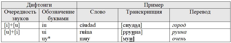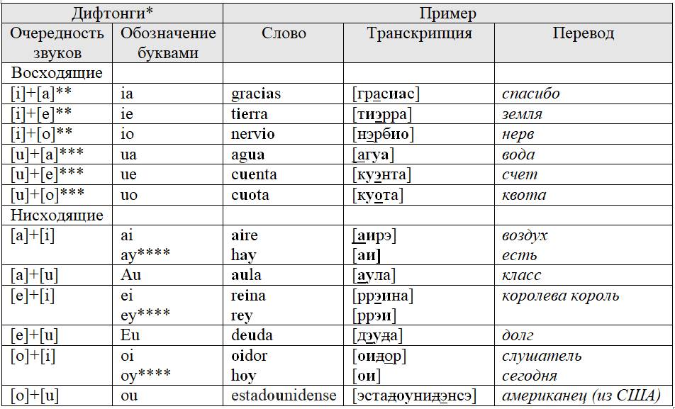 Примечание: *Немая буква Hh между двумя гласными не препятствует образованию дифтонга, например ahumar [аумар] коптить. **Звук [i] в восходящем дифтонге в начале слога произносится как русский согласный звук [й], например iodo[йодо]– йод, hierba [йэрба]– трава. Аналогичное возможно не только в начале слога. Например, слово tierra часть испаноговорящих произносит как [тйэрра].***Звук [u] в восходящем дифтонге может звучать близко к русскому [в], например [агва], [квэнта], [квота]. Нечто похожее происходит и в нашем языке, когда дети слово какао произносят как [какаво] ****Только в конце слова (подробнее см. таблицу буква Yy главы 3).