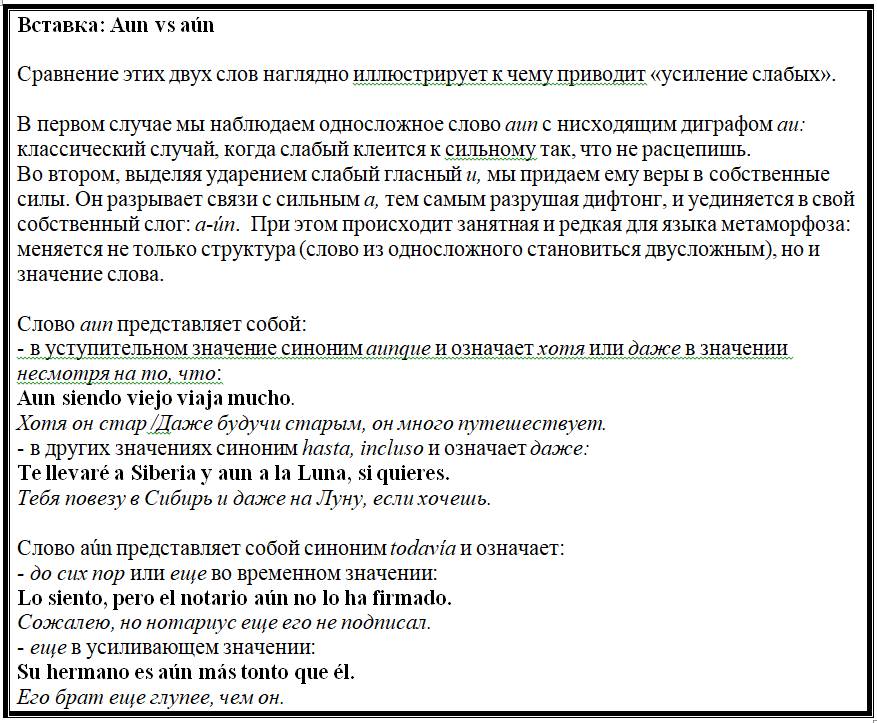 сильного звука с искусственно усиленным слабым звуком, т.е. падением ударением на слабый звук в случаях исключения из общих правил ударений. Очевидно, что «почувствовав силу» слабый звук «приобретает смелость» и по примеру сильных звуков стремиться образовать свой собственный слог, например: ba-úl [ба.ул]– баул, bú-ho [бу.о]– филин, dí-a [ди.а]– день, o-ír [о.ир]– слышать, pa-ís [па.ис]– страна.