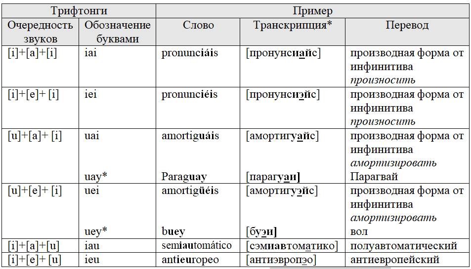 Также следует помнить, что не все последовательности «слабый звук+сильный звук+слабый звук» представляют собой трифтонги. Если какой-либо из слабых гласных несет на себе знак ударения, то вместо трифтонга наблюдается один из двух возможных вариантов: хиа́тус+дифтонг или дифтонг+хиа́тус. Очевидно, что в хиа́тус, как и в случае с дифтонгами, «уходит» искусственно усиленный звук: de-cí-ais, lim-pia-ú-ñas.