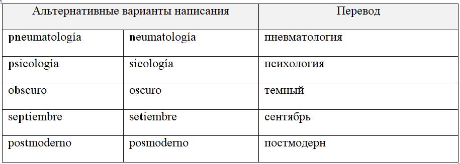 Среди устоявшихся пар разных согласных выделим pn и ps в начале слова, bs в конце слога, pt на стыке слогов, а также st в предлоге post. Поскольку испанцам трудно произносить такие сочетания звуков, часто в речи первая буква «вымывается». Этот феномен настолько распространен, что получил отражение в письменной речи: