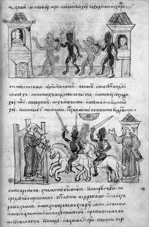 Однако среди крестьян бытовали и другие представления, вызывавшие гнев и презрение образованных слоев общества. Писатели вроде А.А. Коринфского стремились всячески затушевать предания о «ходячих» мертвецах в угоду передовой российской интеллигенции, и так-то «страшно далекой» от народа: «Находятся и теперь такие дотошные всезнаи, что за верное передают россказни о будто бы не принятых землею нераскаянных злодеях»[1]. Но «всезнаи» были осведомлены об исторических корнях лучше уездных лекарей и салонных дам. Скупая информация, почерпнутая из древнерусских летописей, ничего приятного от встречи с покойниками не сулит.