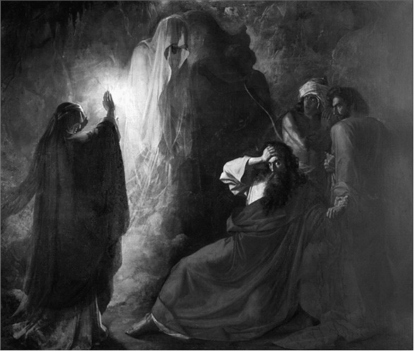 Призрак Самуила представлен в виде традиционной для Руси высокой белой фигуры