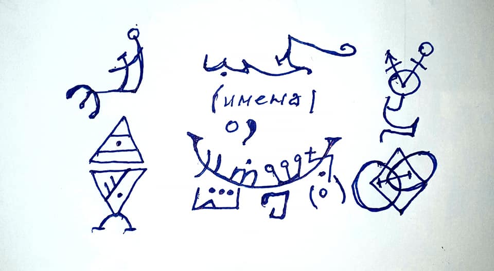 Рисуем знак, смотря на фотографию любимого или любимой. Можно взять фото и рисовать знак на обратной стороне фотографии, если нет, то просто рисуем знак, думаем, о человеке который вас интересует, и читаем следующую мантру, мантру читаем с самого начала как ручка коснулась листа бумаги.