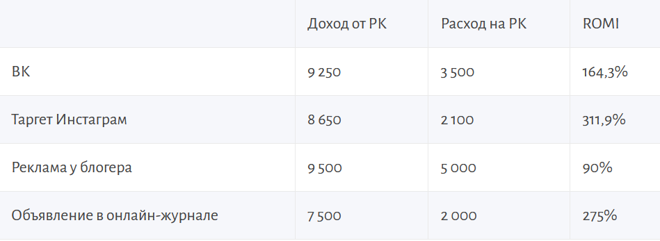 К примеру, берется период – отчетный месяц. За последние 30 дней клиника продвигалась через ВК, таргет Инстаграма, брала рекламу у местного бьюти-блогера и давала объявление в информационный онлайн-журнал (целевая аудитория: от 18 до 40 лет, высшее оконченное и незавершенное образование, средний и выше среднего доход). Маркетер собирает воедино необходимые цифры и рассчитывает ROMI.