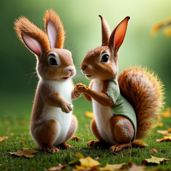 Завязалась настоящая драка. Ушастые малыши кувыркались по траве, их мех превращался в клубок эмоций, а по лесу раздавались вздохи и визги недовольства. Но внезапно, из-за кустов, как ветерок с верхушек деревьев, появилось еще одно создание – бельчонок Шустрик. Подпрыгивая, он внимательно наблюдал за перепалкой.