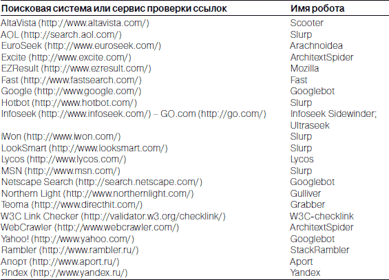 В табл. 1 приведены имена роботов некоторых поисковых систем.