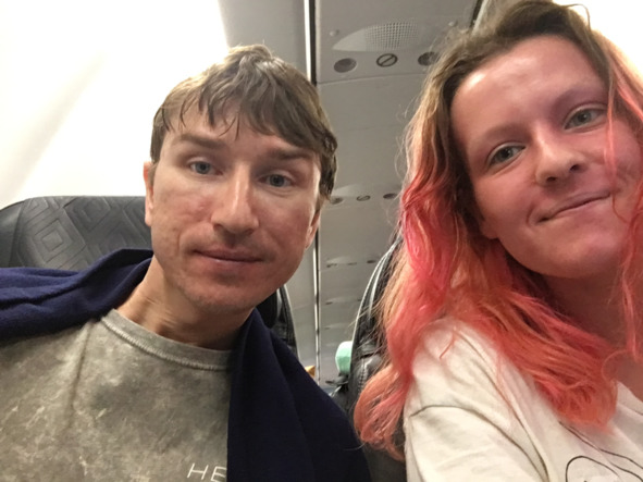 Я говорю: «Ну покажи свой посадочный талон. Он достаёт талон, у него место 11H, у меня 11K. Я говорю, что его место там, где 4 сиденья в среднем блоке. Он ответил: «А, ну ладно, хорошо, всё, я взял и пересел». А я сел с девушкой рядом. Она была блондинка с веснушками. Я у него спросил сразу, ты говоришь по-русски? Потому что я по внешнему виду понял это. Она говорит: «Да», ну и мы начали с ней разговаривать.