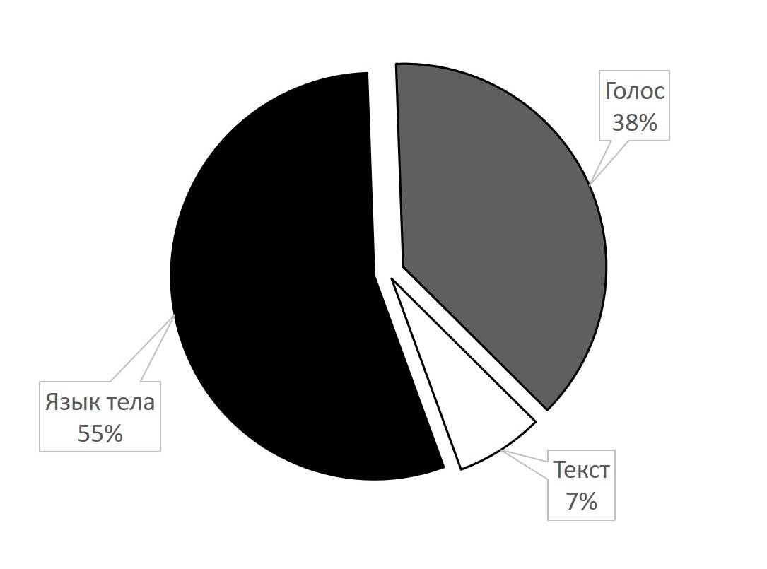 Знаете такую теорию, что во время коммуникации ваш собеседник или аудитория воспринимает только 7% информации из ваших слов? 38% восприятия приходится на интонацию и громкость голоса, а 55% – на то, как вы жестикулируете или как выглядите?