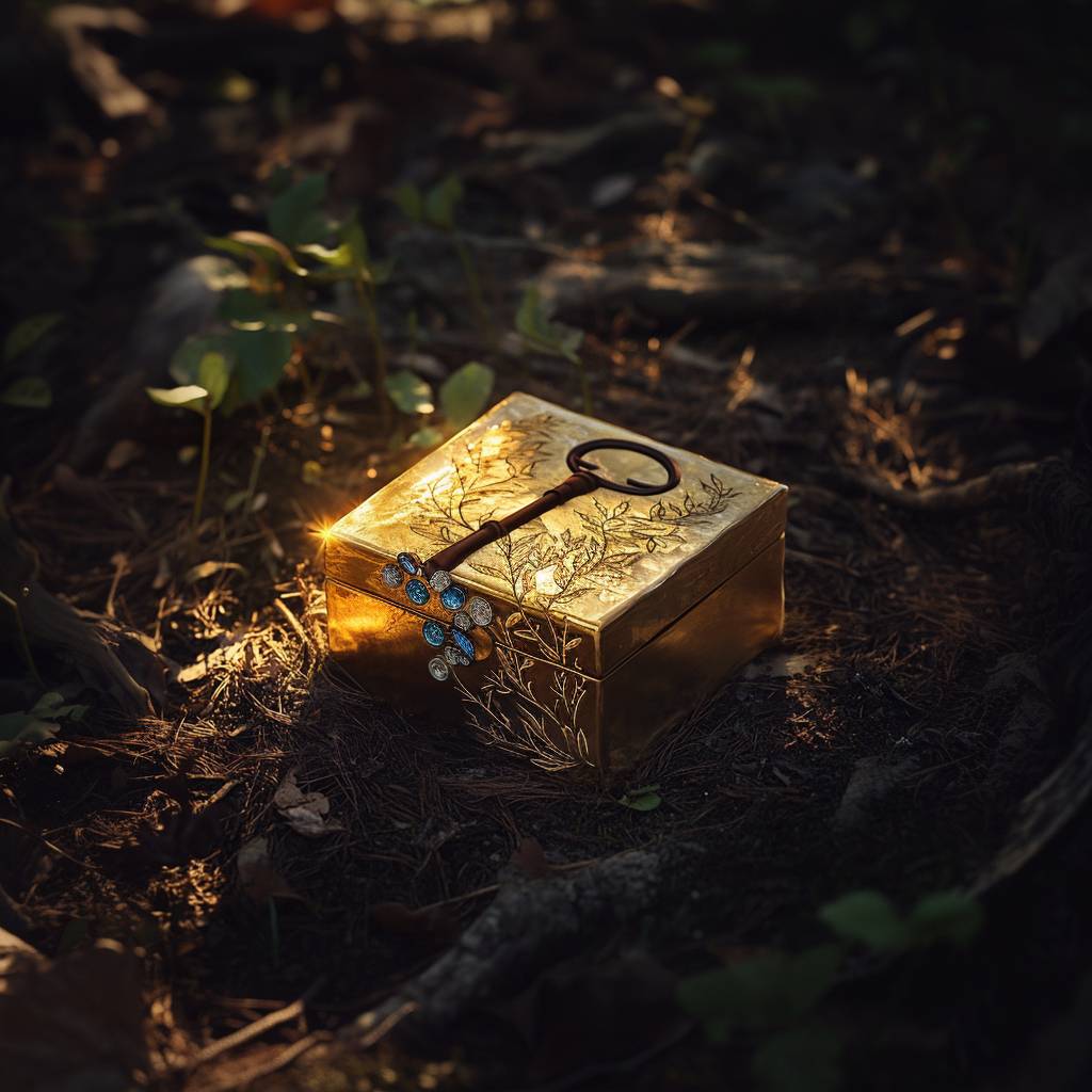 Однажды утром Карамелько выбежал из своей уютной норки и заметил что-то необычное: на опушке леса блестел странный предмет. Маленький кролик осторожно подошел ближе и увидел, что это была золотая шкатулка, украшенная замысловатыми узорами и драгоценными камнями.