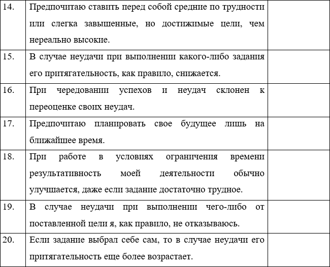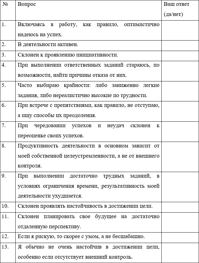 Инструкция: отвечая на нижеприведенные вопросы, необходимо выбрать ответ да или нет. Если вы затрудняетесь с ответом, то вспомните, что положительный ответ объединяет как явное да, так и «скорее да, чем нет». То же относится и к ответу нет: он объединяет явное нет и «скорее нет, чем да».