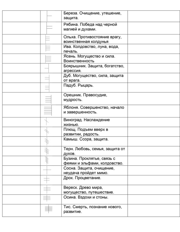 Подробное значение кроится в символическом значении дерева, я опишу это позже, где про каждое растение будет подробно. А тут краткое значение для гаданий. Перевернутое значение символов – недостаток или нехватка этого качества.