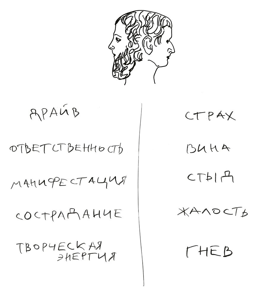 Помимо пар страх – драйв и гнев – творческая энергия, я выделяю еще три: вина и ответственность; стыд и манифестация; жалость и сострадание.